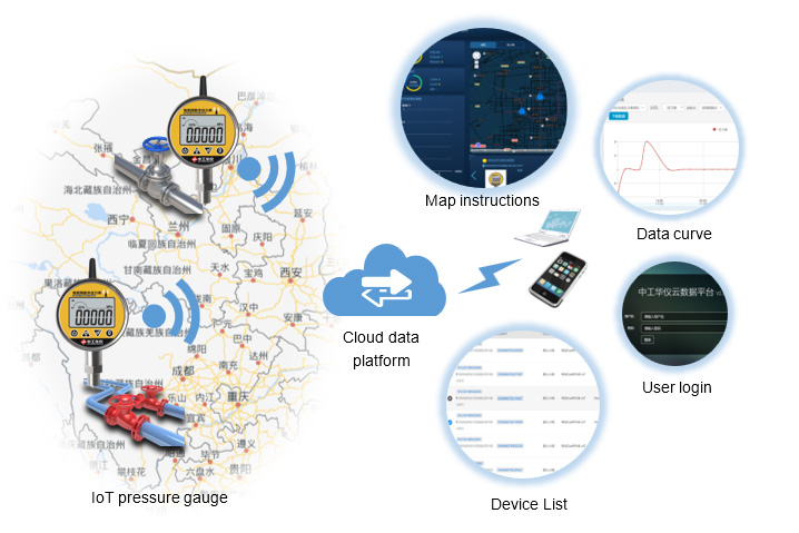 The wireless pressure monitoring system is composed of HD-100N IoT digital pressure gauge, cloud data platform and terminal equipment. HD-100N IoT digital pressure gauge is responsible for collecting pressure data, and adopts the latest 4G LTE, NB-iot and other IoT technologies to upload the data to the cloud data platform. Realized pressure data real-time monitoring, data recording, over-limit alarm etc. functions. Users can monitor pressure data in real time through terminal devices such as computers, tablets, and mobile phones. The system is widely used in fields such as fire pipe network pressure monitoring, water service pipe network pressure monitoring, petrochemical pipeline pressure monitoring and so on.